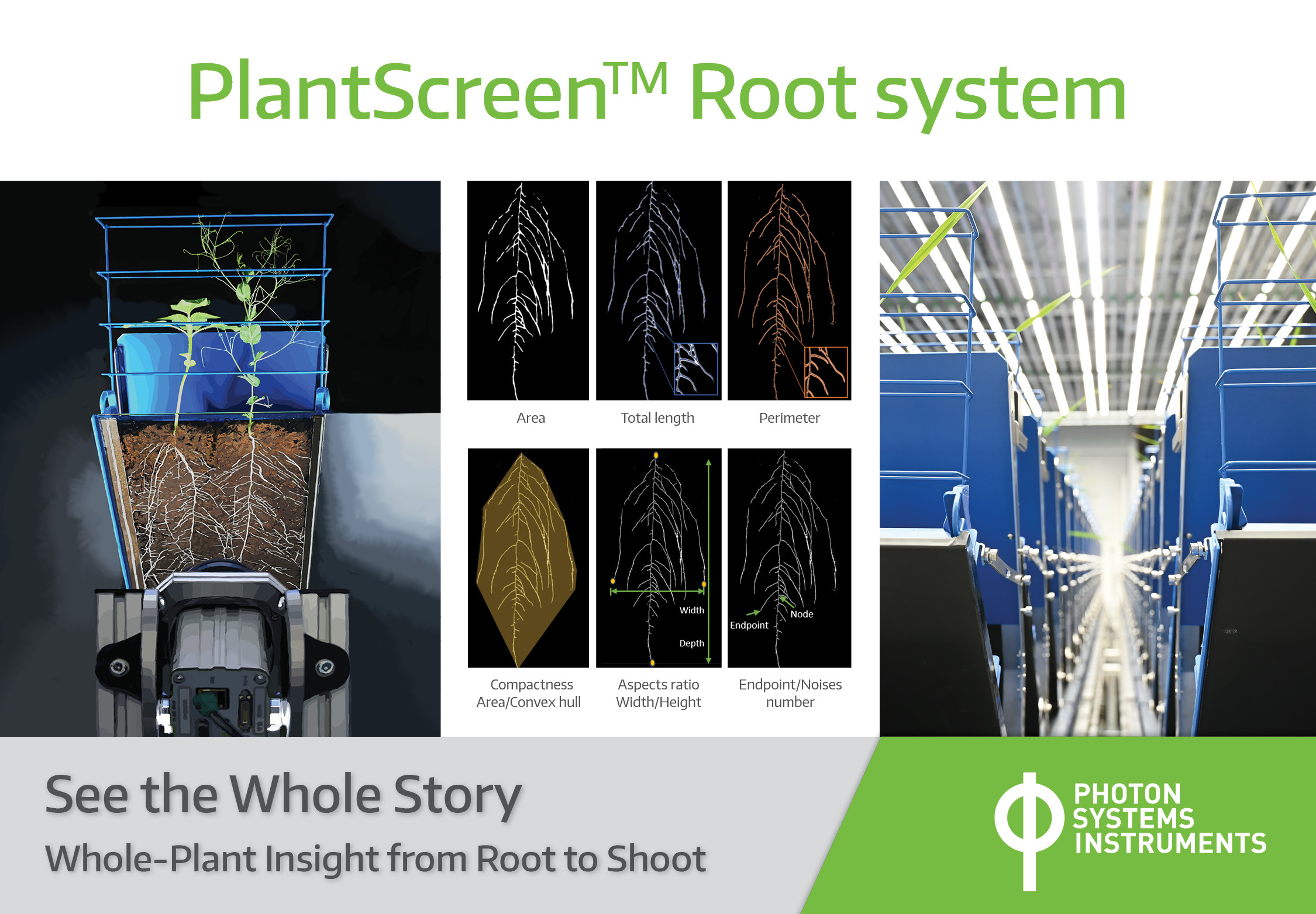 This addition to PSI’s line of PlantscreenTM Phenotyping Systems allows automated imaging and non-invasive analysis of roots and shoots of plants grown in soil-filled rhizotrons. The rhizotrons are moved robotically through imaging and watering and weighing stations, and are transported by a conveyor system to and from a growth area with precisely controlled environmental conditions.